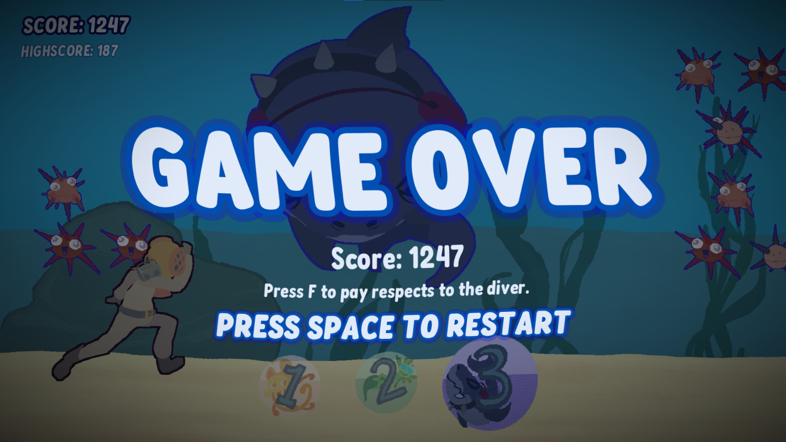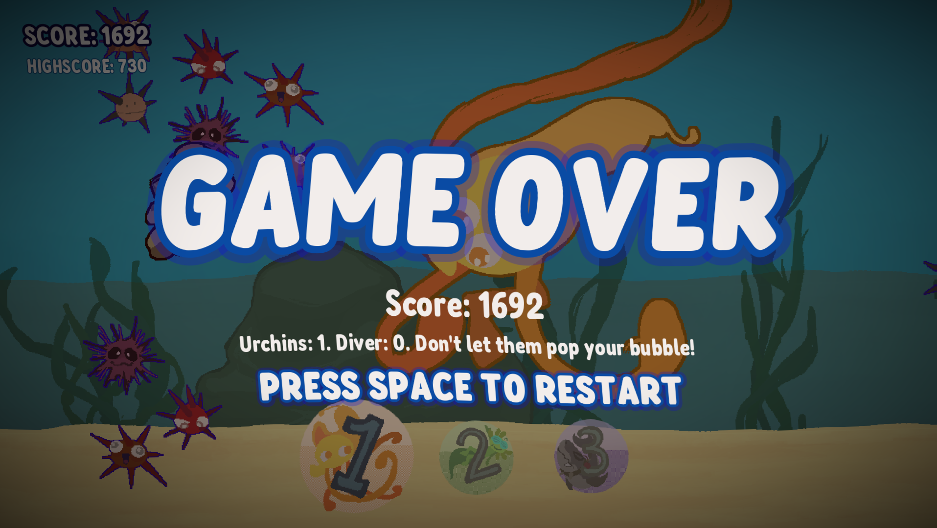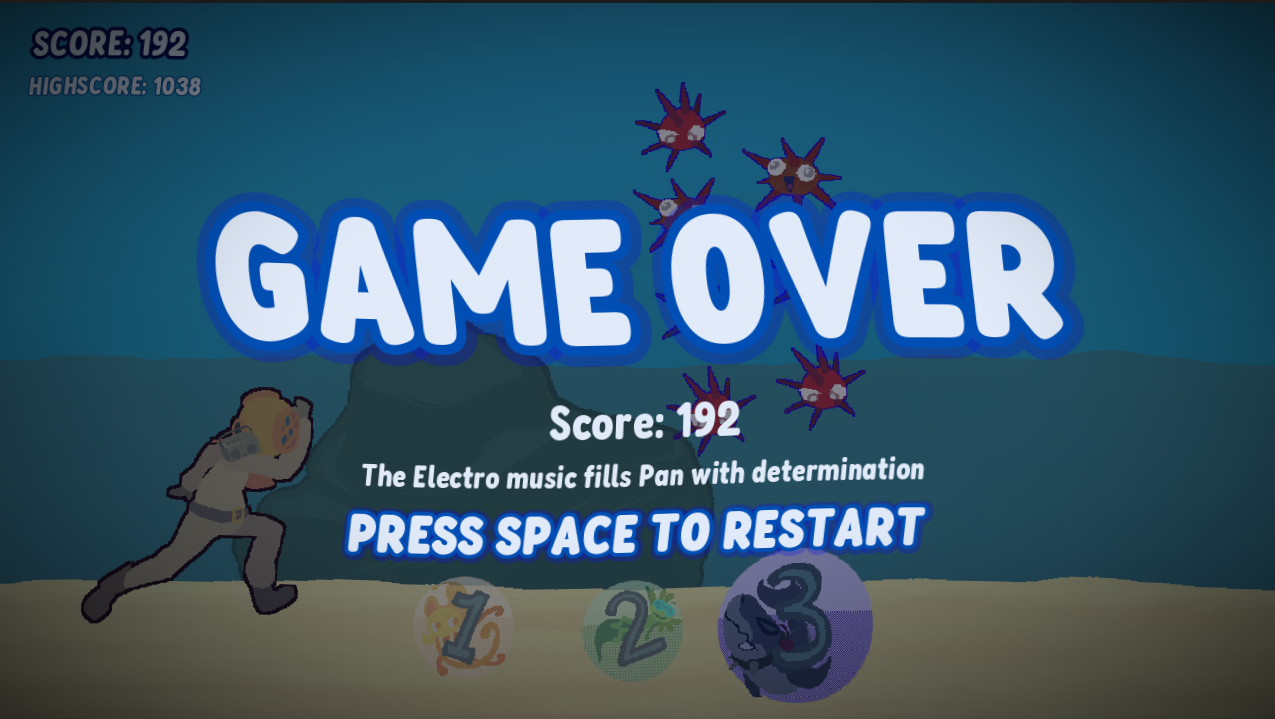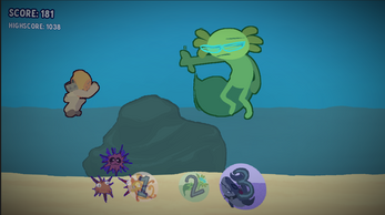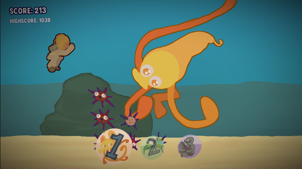 Lovely creatures of the deep that go perfectly with the soundtrack and have a consistent art style. The increasing difficulty over time is motivating! A beautiful game.